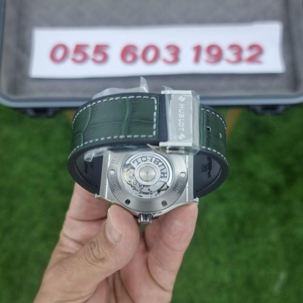 ساعة هوبلت كلاسيك فيوجن تجمع بين التصميم الأنيق والتقنيات المتطورة.تتميز بهيكل من الفولاذ المقاوم للصدأ وميناء أخضر مع علامات معدنية لامعة تعزز جمالية التصميم. سوارها الربل المغطي بجلد باللون الأخضر يوفر تجربة ارتداء مريحة، بينما تكشف الخلفية الشفافة عن تفاصيل الآلية الأوتوماتيكية المعتمدة على حركة اليد، لتقديم مظهر جمالي آسر وعملي.